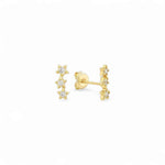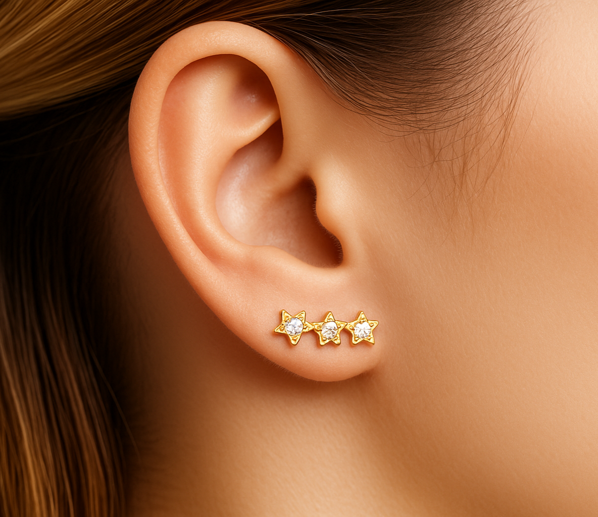 The 3 Mini Stars Studs from our STUDS Collection feature a delicate row of three star-shaped accents, capturing the light with subtle brilliance. Crafted from 925 sterling silver and finished in 18k gold plating, these earrings bring a whimsical yet elegant touch—perfect for daily wear or adding dimension to an ear stack.
