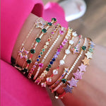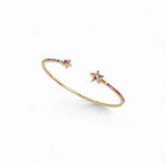 Add a playful sparkle to your wrist with this starry cuff bracelet. Featuring two shooting stars encrusted with vibrant multicolor CZ stones, this piece captures a whimsical, joyful charm while keeping a modern and delicate look. Perfect for layering or wearing solo.