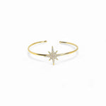 This elegant open cuff bracelet draws inspiration from the night sky, featuring a radiant star-shaped center encrusted with pavé-set CZ stones. Its refined silhouette and celestial charm make it a timeless piece for those who seek understated brilliance.