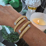 The Crossed Coil Bangle is a standout piece from our Brass Bangle Collection, featuring a flexible coil-inspired silhouette that wraps elegantly around the wrist. Crafted from durable brass with a rich 18k gold plating, it’s finished with pavé cubic zirconia caps for a subtle sparkle. This bangle merges structure and movement. Perfect for elevating both casual and formal looks.