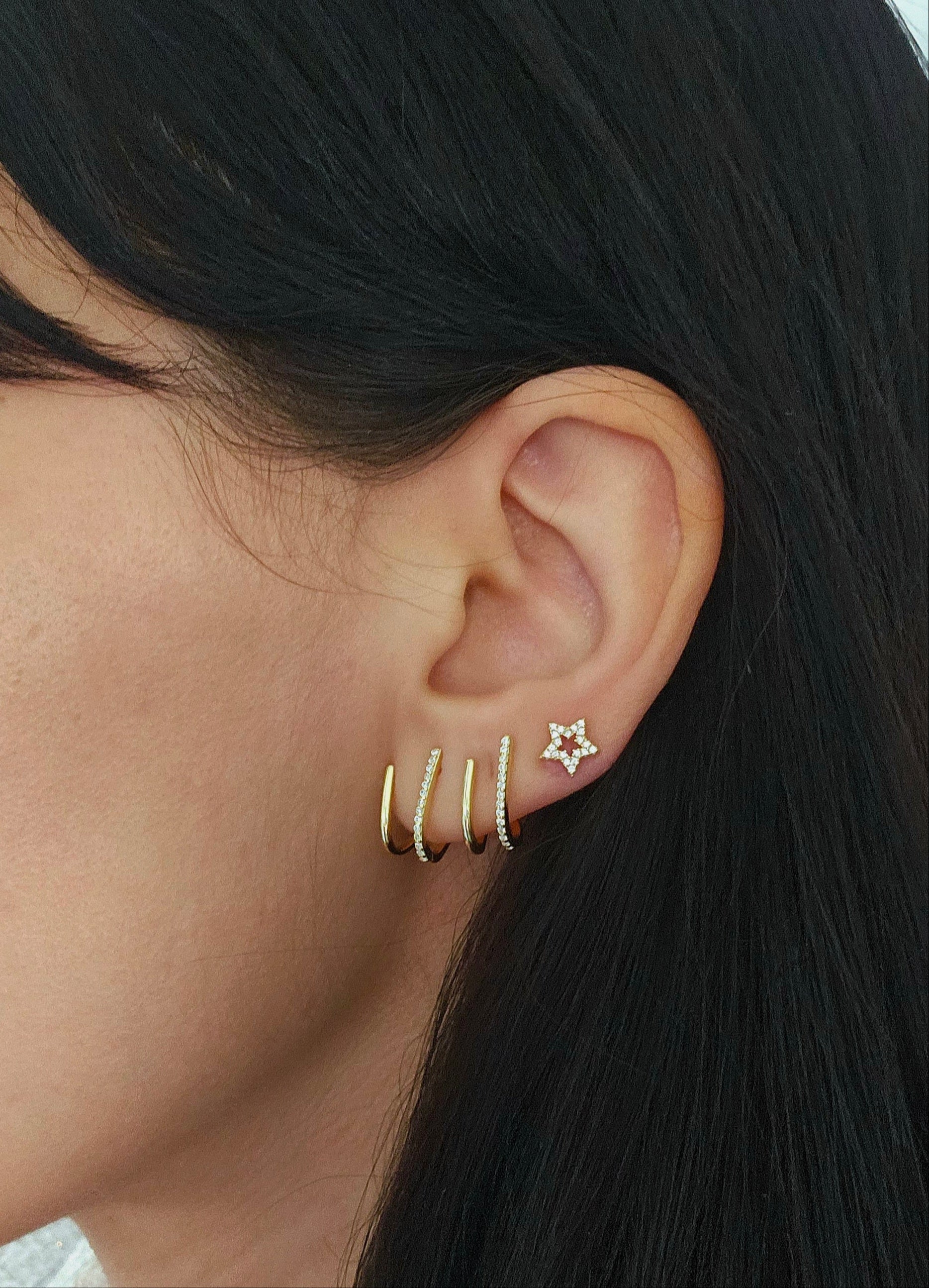 The EA Pentastar CZ Stud from our STUDS Collection features a five-point star design adorned with 5A cubic zirconia stones, combining bold shape with refined brilliance. Crafted from 925 sterling silver and finished in 18k gold plating, it's a striking accent piece that balances edge and elegance effortlessly.