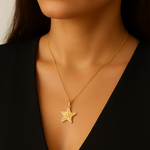 The Starflare Necklace from our Chain with Pendant Collection features a radiant star-shaped pendant adorned with 5A cubic zirconia stones, capturing the glow of the night sky. Crafted from 925 sterling silver and finished in 18k gold plating, it’s a refined piece that adds sparkle and meaning to any look—ideal as a gift or for your own collection.